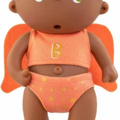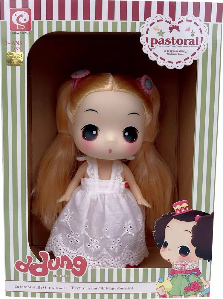 PoupĂ©e articulĂ©e de 18 cm, en vinyle. Elle porte une robe blanche champĂȘtre, des Ă©lastiques dans les cheveux, une culotte et des chaussures. Les vĂȘtements sont amovibles. Un portant de prĂ©sentation inclus permet de faire tenir la poupĂ©e debout. dimensions 18.5 x 9.5 x 25 cm. Licence : Ddung.