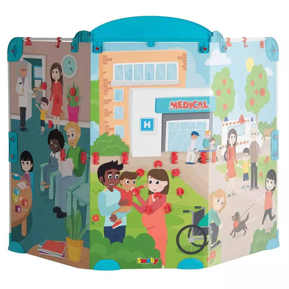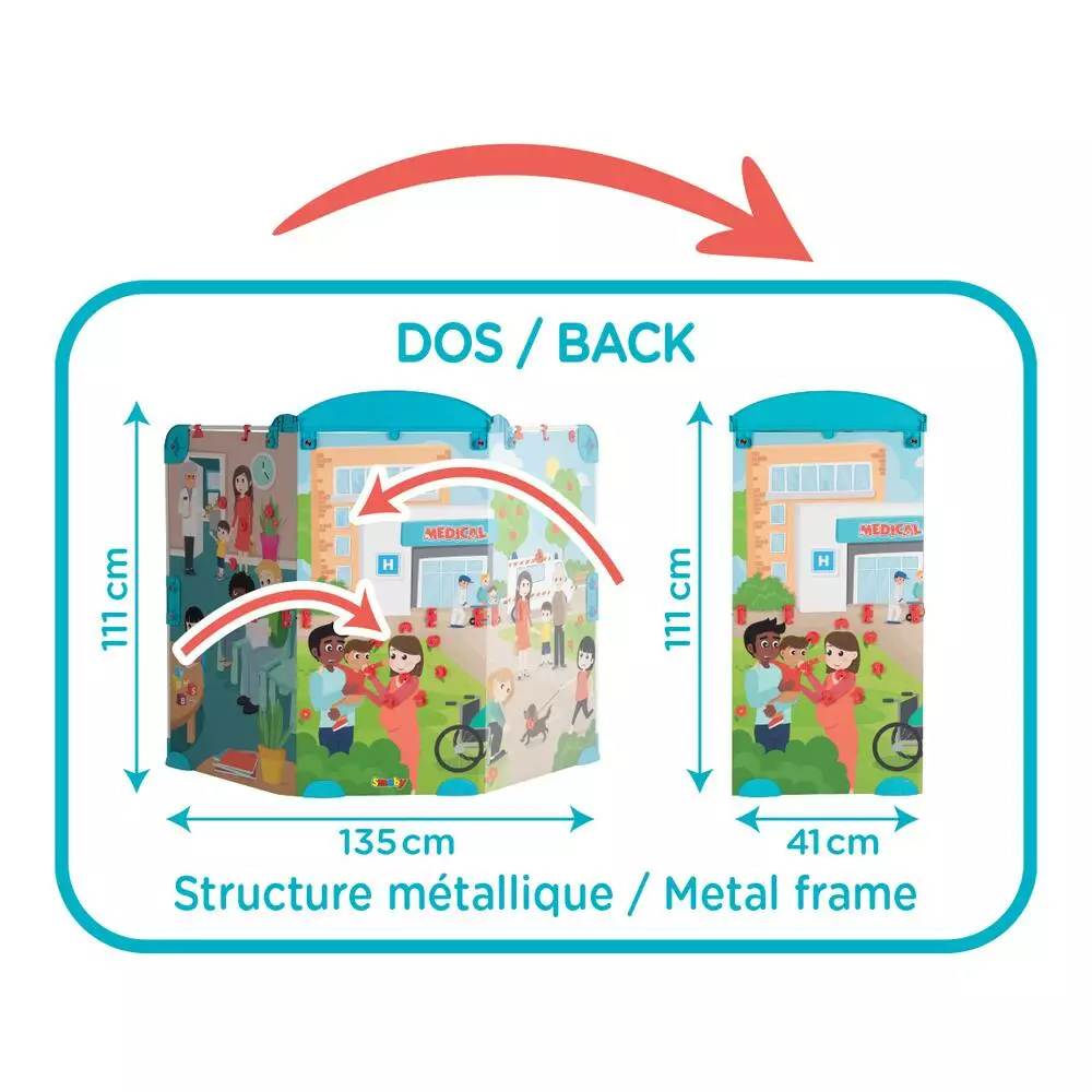 Coin radiologie : 5 radios Ă observer (tĂȘte, bras, corps, 2 pieds) ou Ă placer sur les 2 silhouettes pour recrĂ©er un squelette. Reconnaissance des parties du corps. L’enfant peut Ă©galement ajouter des Ă©lĂ©ments comme un masque chirurgical ou des bandages grĂące au velcro. Partie nutrition : l’enfant peut identifier ce qu’il a mangĂ© durant la journĂ©e en accrochant les pastilles repas sur les crochets. Echelle optomĂ©trique : test de la vue grĂące aux lunettes ophtalmologiques pour tester un Ćil puis l’autre, test des couleurs primaires et du daltonisme (objet ou animal e aux lunettes ophtalmologiques pour tester un Ćil puis l’autre, test des couleurs primaires et du daltonisme (objet ou animal Ă identifier). Horloge des bobos : 7 personnages qui ont tous des maux. L’enfant doit trouver les solutions aux problĂšmes et les accrocher au bon endroit sur les crochets. Echelle de croissance fille ou garçon avec une femme enceinte oĂč l’enfant pourra indiquer le sexe du bĂ©bĂ© Ă venir. Toise avec Ă©querre jusqu’Ă 1m20. Horloge expliquant le dĂ©roulĂ© d’une consultation chez le mĂ©decin, faire les bons gestes avec les accessoires fournis. PĂšse-personne avec une aiguille pour indiquer son poids. La base du jeu est un triptyque avec des tubes en mĂ©tal et 4 pieds. Les tablettes renforcent la soliditĂ© du jeu une fois ouvert. Le triptyque est dĂ©corĂ© avec plusieurs Ă©lĂ©ments rappelant un cabinet : un bureau avec un diplĂŽme du docteur oĂč l’enfant peut