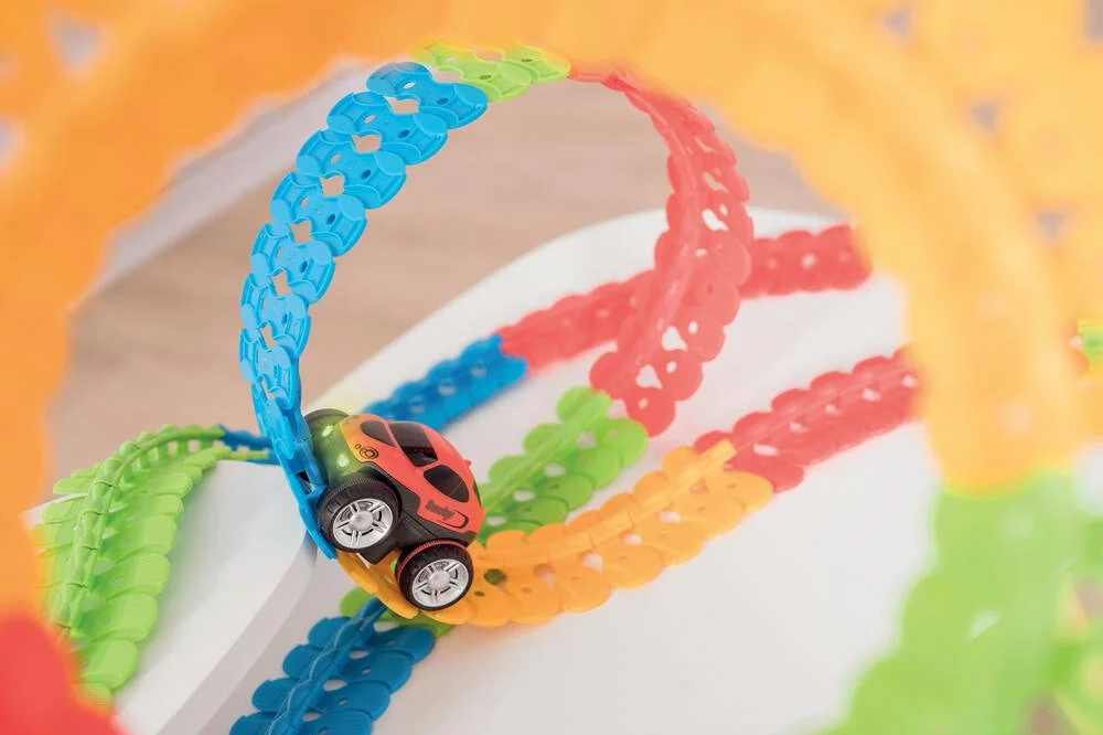 184 pièces flexibles pour créer une multitude de circuits ! Longueur de piste : 4,4 mètres. Avec 1 véhicule (à roues libres), 1 carrosserie et 1 pièce entré/sortie.
