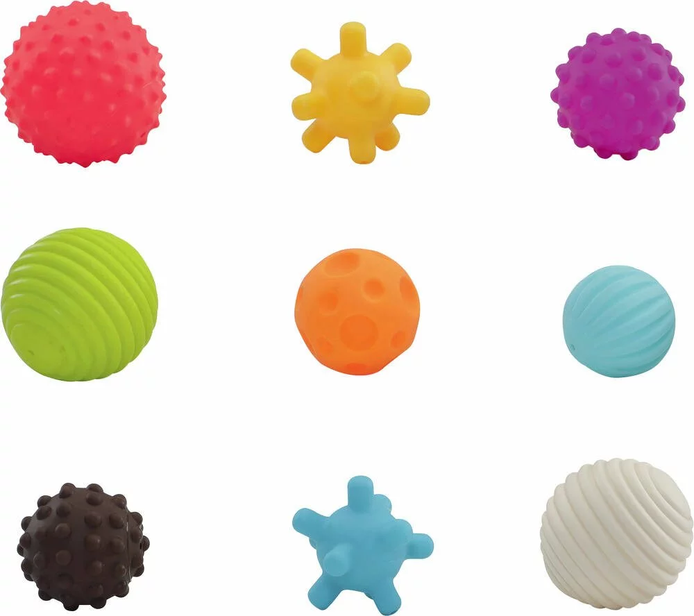 Contient 9 balles sensorielles. MatiÚre douce au toucher et souple. Amusant et facile à manipuler : bébé découvre différentes formes et couleurs. Livré dans un sac zippé en plastique transparent : pratique tout se range et se transporte dedans. Dimensions du sac : 24.5 x 11 x 23 cm. Développe la motricité. Stimulation sensorielle.