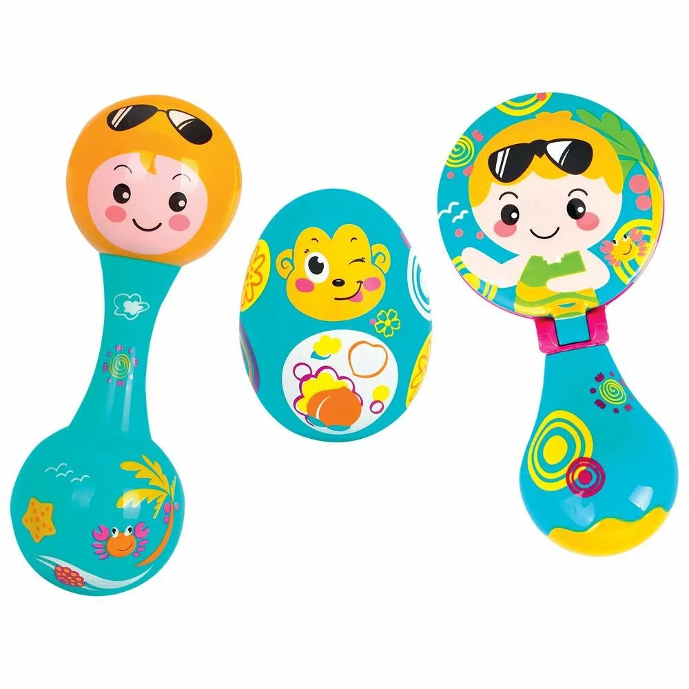 Set de 3 hochets colorés et ludiques. Avec 1 maraca double, 1 œuf musical et 1 castagnette. Pour les musiciens en herbe. Apprendre à travers le jeu stimule l’intérêt de votre enfant pour la musique. Ce jeu développe les capacités d’écoute et la créativité musicale. Améliore la concentration et la coordination. Matière : ABS. Dimensions de la maraca double : 5 x 5 x 15 cm, de l’oeuf : 4 x 4 x 8 cm, de la castagnette : 5 x 5 x 14 cm.