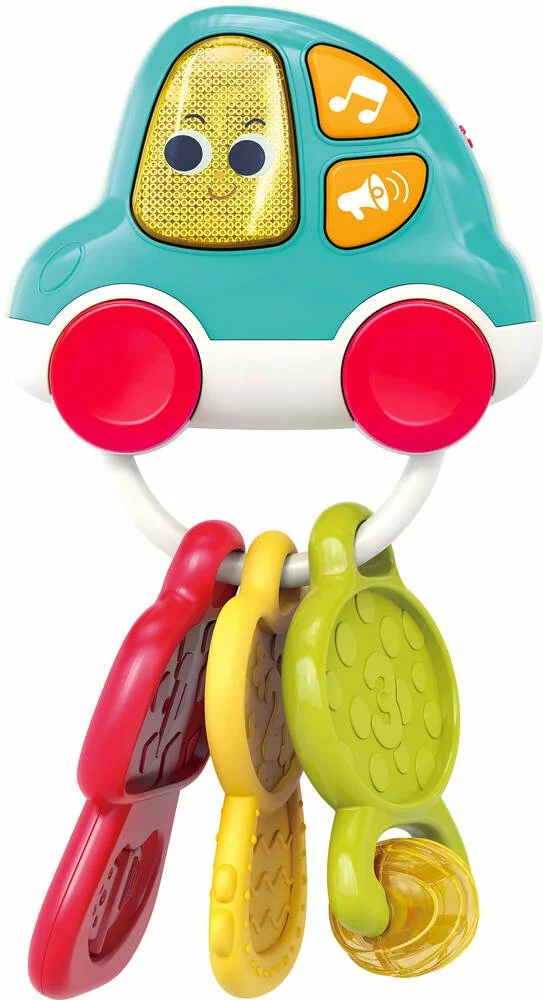 Porte-clés en forme de voiture musical. 3 clés de couleurs différentes : pièce tournante, hochet et anneau dentition. Voiture avec effet lumineux : lumières intégrées. Nombreux effets sonores : 7 sons de voiture, 7 sons rigolos et 5 musiques différentes. Aucune langue parlée : ne parle pas. 2 piles LR03 fournies. Fonction Try Me. Bouton marche-arrêt. Instructions imprimées sur la boîte. Jouet amusant et éducatif. Jolie forme de voiture. Capacité d’imitation. Sensibilisation à la musique. Les différentes textures, couleurs, chiffres et objets favorisent le développement sensoriel de votre bébé. Dextérité des doigts. Bouton de musique : appuie sur ce bouton pour jouer l’une des chansons intégrées. Bouton de klaxon : appuie sur ce bouton pour activer des effets sonores tels que klaxon de la voiture, le moteur et le son de verrouillage/déverrouillage. Bouton de dessin animé : appuie sur ce bouton pour écouter un son amusant comme dans un dessin animé. 3 clés de couleur : clé avec pièce tournante, à hochet et de dentition.