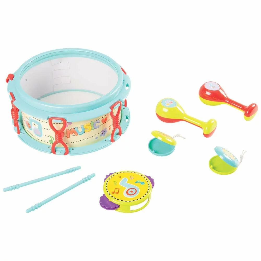 Set d’instruments de musique : 1 tambour, 2 baguettes, 1 tambourin, 2 maracas et 2 castagnettes. Pratique : tout se range dans le tambour. Participe à l’apprentissage de la musique et à l’éveil musical. Facile à manipuler. Eveil les sens de l’enfant tout en l’amusant. En plastique. Dimensions du tambour : 27,5 x 27.5 x 12.5 cm, du tambourin : 12,73 x 11,36 x 2,78 cm, des maracas : 5,93 x 4,63 x 15,2 cm.