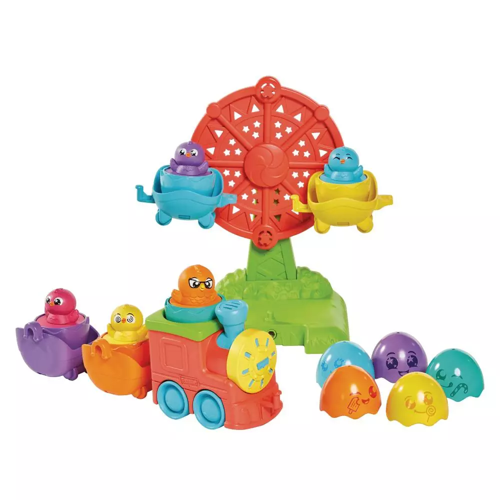 Fais tourner la grande roue ou construis le train ! Contient 1 grande roue, 1 locomotive, 4 wagons et 5 animaux.