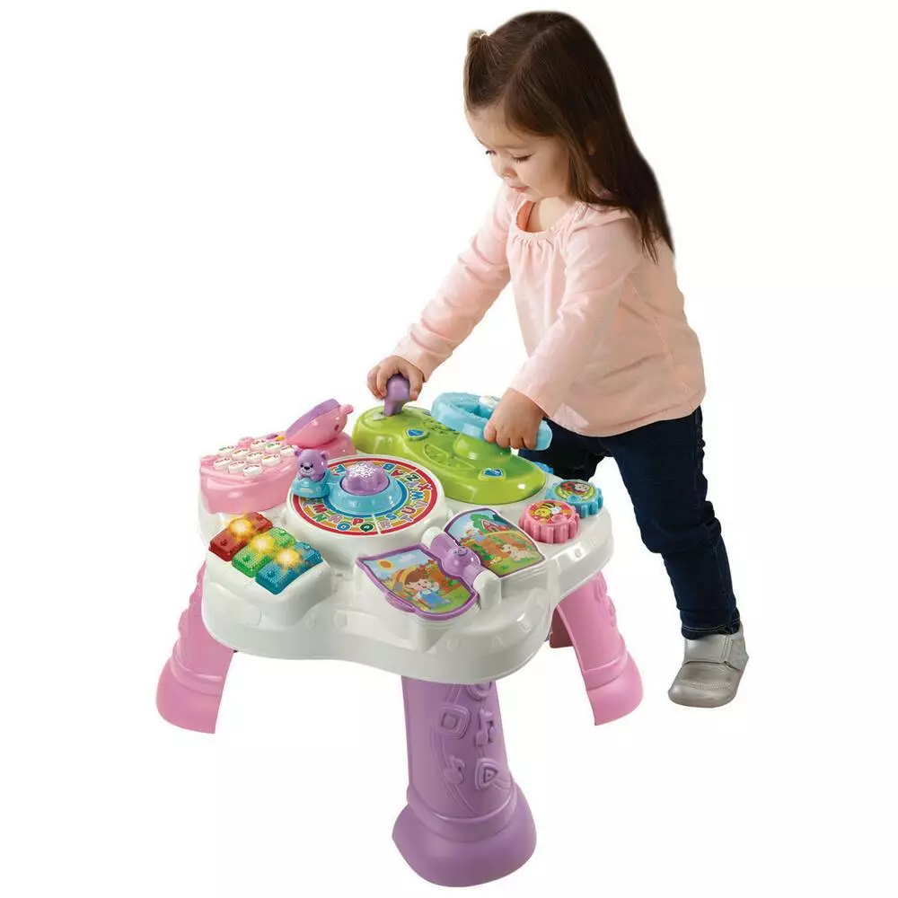 Ma table d’activités bilingue rose. De 9 à 36 mois. 2 en 1 : tableau d’éveil pour jouer au sol et table d’activités ! 100% bilingue : français et anglais. Un volant avec un bouton Klaxon pour faire tourner l’ourson et découvrir l’alphabet en musique. Un levier de vitesses, un livret avec deux doubles-pages à manipuler pour découvrir 4 chansons illustrées. Trois grosses touches de piano lumineuses pour initier Bébé à la musique, découvrir les couleurs et les formes. Un téléphone amovible et son clavier pour découvrir les chiffres, le nom des animaux et leur cri. Un bouton étoile au centre de la table pour déclencher dix mélodies, une chanson et des sons rigolos.Des engrenages pour développer la motricité de Bébé. 4 pieds détachables pour le jeu au sol. 6 chansons et 20 mélodies. Réglage du volume sonore et arrêt automatique.