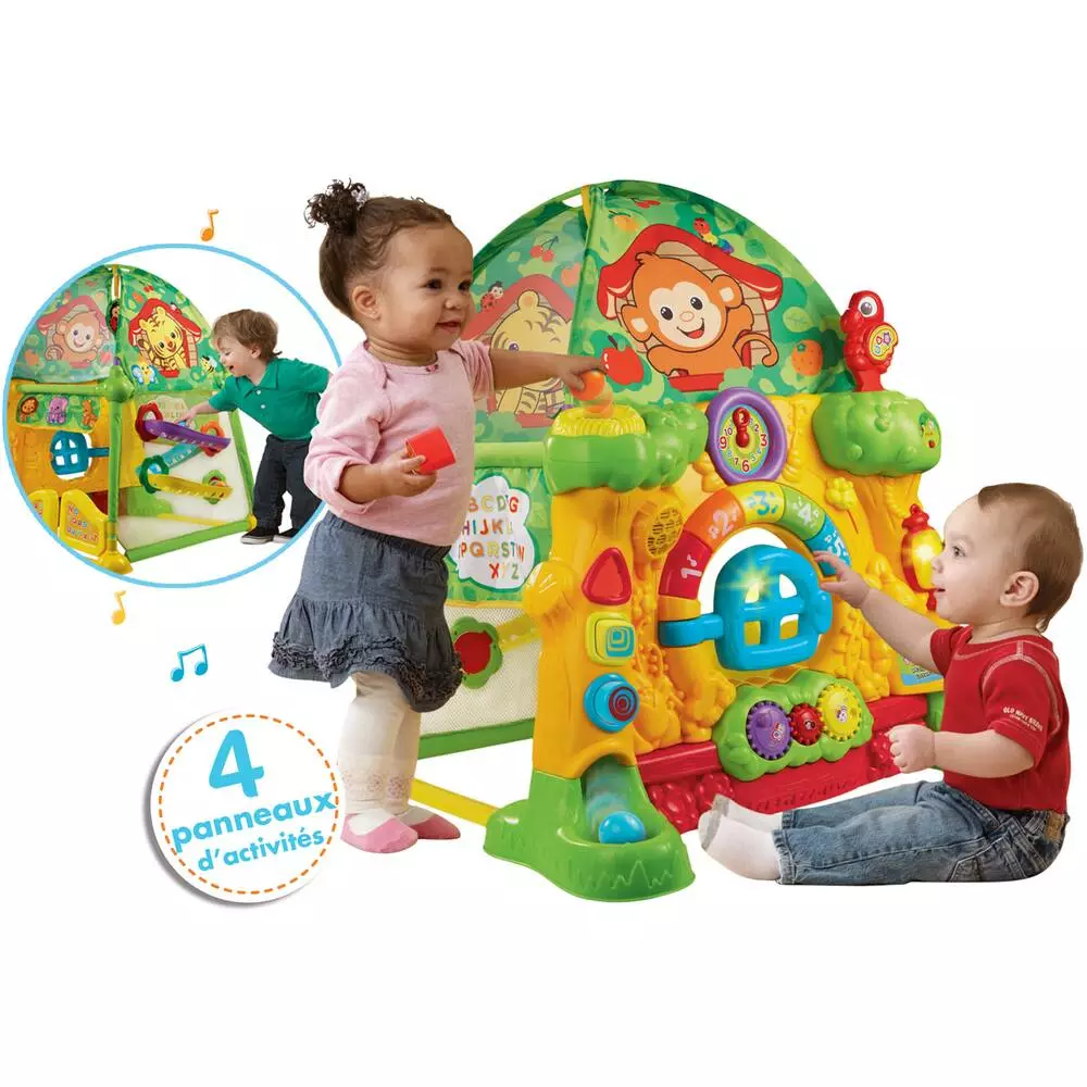 Une super cabane interactive parlante, musicale et lumineuse pour faire plein de découvertes et jouer à cache-cache. Bébé peut jouer à l’intérieur et à l’extérieur de la cabane grâce aux 4 panneaux d’activités. Il apprend les couleurs, les formes, les animaux, les moments de la journée, l’alphabet et les chiffres. 20 activités de manipulation : bébé peut ramper, s’asseoir et se mettre debout. 1 fenêtre et 1 porte battante pour jouer à cache-cache. 1 toboggan à balles. 1 tableau d’activités interactif avec : 1 piano pour découvrir la musique, 1 trieur de forme, des balles colorées et 1 horloge pour apprendre les chiffres et les moments de la journée. Des engrenages, 1 panneau abécédaire et plus de 40 mélodies, chansons, effets sonores et phrases. Réglage du volume sonore. Arrêt automatique.