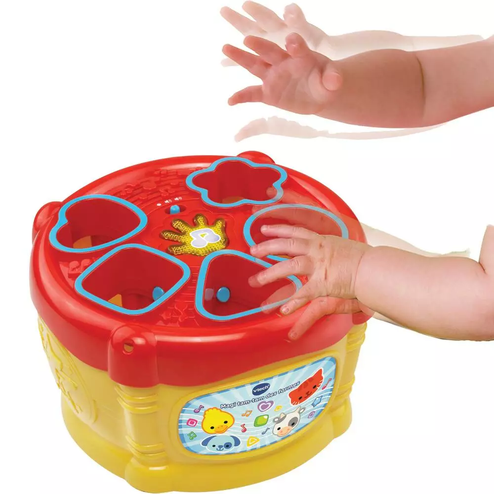 Bébé déclenche des sons rigolos en tapant sur le tam-tam interactif et découvre les formes, les chiffres et les animaux grâce au trieur de formes. 20 mélodies et 3 chansons incluses.