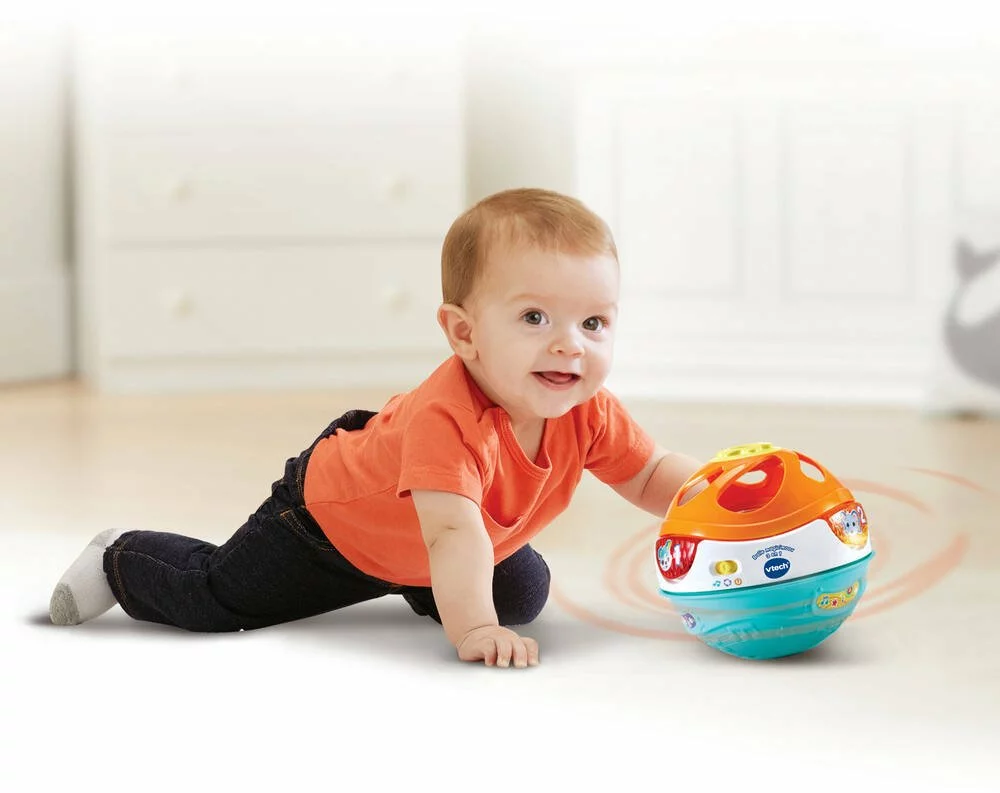 Une balle 3 en 1 à transformer en balle, roller ou tambour. Magique ! Elle roule toute seule et incite Bébé à la suivre pour développer sa motricité globale. 3 boutons lumineux et 2 modes de jeu pour faire le plein de découvertes. Trop rigolo ! La petite balle à l’intérieur de la partie haute se déplace et déclenche des sons amusants. De nombreuses interactions, mélodies et chansons. Arrêt automatique.