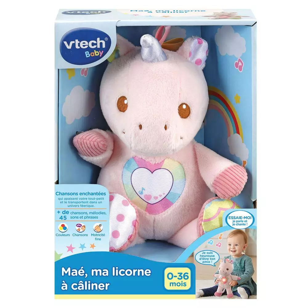 Maé ma licorne à câliner. De 0 à 36 mois. De nombreuses matières pour stimuler le sens du toucher : papier bruissant, tissu satiné, velours, matière peluche. Un bouton lumineux sur le ventre (avec variations de couleurs) pour déclencher des musiques douces et des phrases amusantes. Plus de 50 chansons, mélodies, sons et phrases. Module électronique détachable pour lavage en surface. Arrêt automatique.
