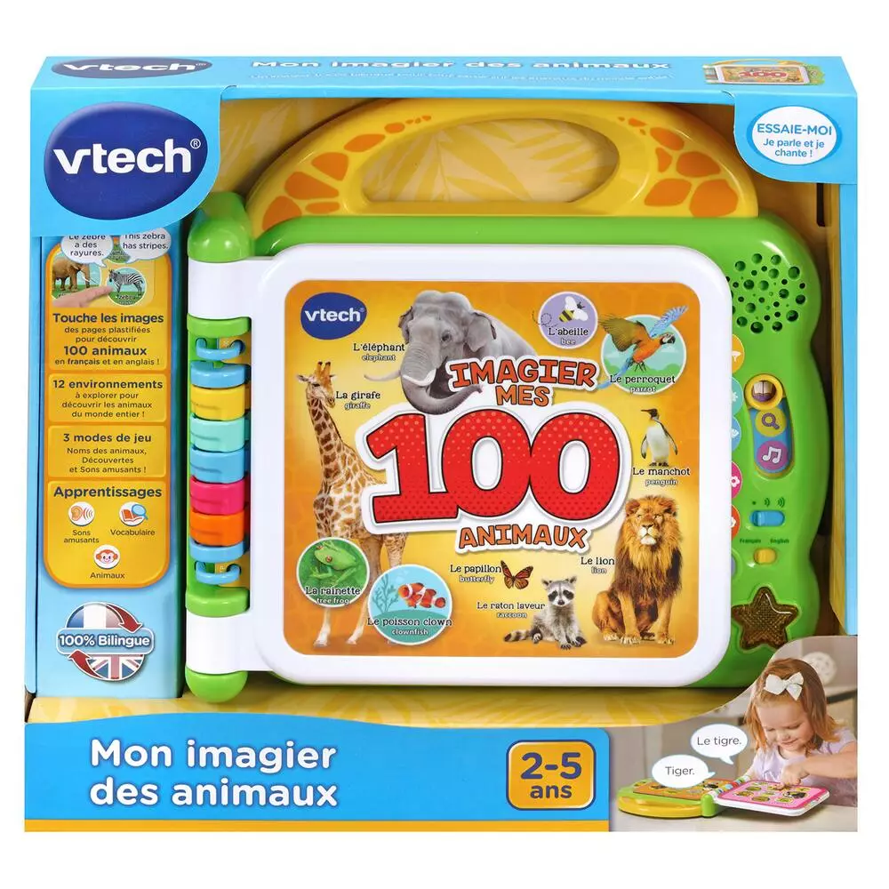 Mon imagier des animaux bilingue. De 1,5 à 4 ans. Cet imagier parlant et interactif permet de découvrir 100 animaux en français et en anglais. Le livre comporte 12 pages éducatives plastifiées et illustrées avec capteurs sensitifs pour sélectionner les illustrations et faire de nombreuses découvertes. Chaque page d’apprentissage est classée par thème : animaux de la ferme, de la savane, de la jungle… Avec photos et illustrations. 3 modes de jeu : Vocabulaire, Découvertes et Sons amusants. La poignée adaptée aux petits permet une prise en main facile. 2 chansons et des effets sonores amusants. 100 % bilingue (français / anglais) ! Arrêt automatique.