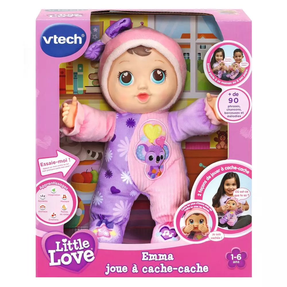 Little Love. Emma joue à cache-cache. De 1 à 6 ans. La poupée réagit quand on pose les mains sur ses yeux. 4 boutons interactifs : 1 bouton coeur pour découvrir les parties du corps et entendre battre son coeur. 1 bouton sur son ventre pour savoir si elle a faim. 2 boutons sur ses pieds pour déclencher mélodies, berceuses et apprendre à compter. Effets lumineux sur son petit bonnet. 5 chansons et 20 douces mélodies. Poupée en velours tout doux de 32 cm. Arrêt automatique.