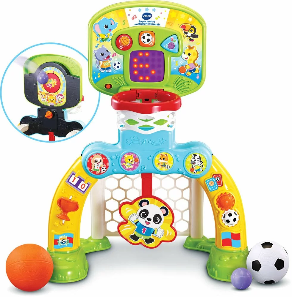 Joue au basket, au foot et vise la cible ! L’écran affiche tes points : apprends à compter jusqu’à 10 ! Hauteur ajustable. Plus de 65 chansons, mélodies, phrases et sons et 3 balles incluses.