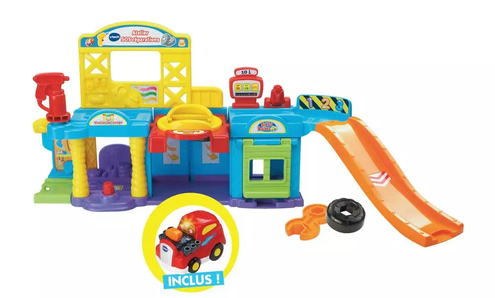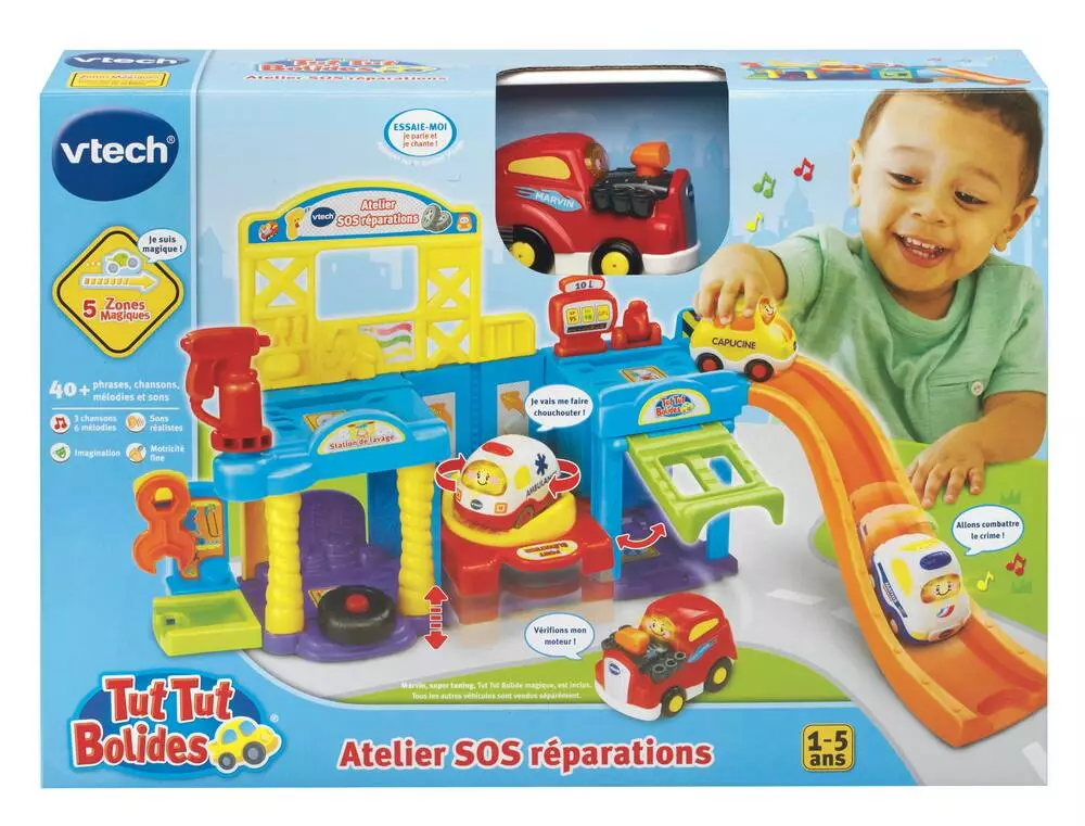 Un atelier pour rĂ©parer et customiser le vĂ©hicule Tut Tut Bolides ! Un super ascenseur hydraulique avec plateforme pivotante permet d’emmener les vĂ©hicules pour la rĂ©paration. 1 station d’essence avec 1 rampe Ă dĂ©valer lorsqu’on a fait le plein, 1 place de parking avec porte-battante pour garer un vĂ©hicule, 1 atelier carrosserie avec bombe de peinture pivotante pour jouer Ă repeindre sa voiture et 2 piĂšces de jeu incluses qui dĂ©clenchent des sons rigolos : une clĂ© pour l’atelier de rĂ©paration et un pneu Ă installer et faire tourner. Le vĂ©hicule Ă©lectronique Marvin super tuning inclus dĂ©clenche des phrases et des sons amusants lorsqu’il passe au-dessus des 5 « zones magiques ». 3 chansons et 6 mĂ©lodies entraĂźnantes. Compatible avec les autres univers de jeu Tut Tut Bolides.