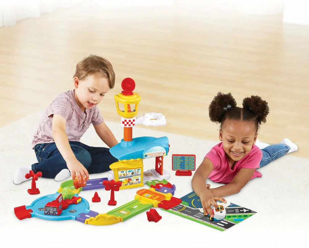 Mon premier aéroport super décollage (+Eliot super pilote) – 1 – 5 ans Un aéroport complet avec de nombreux éléments de jeu pour faire voyager les Tut Tut Bolides. Le véhicule électronique inclus, « Eliot super pilote », déclenche des phrases, des chansons et des sons amusants lorsqu’il passe sur les 5 zones magiques. La piste de décollage permet aux Tut Tut Bolides de s’élancer dans les airs. Une zone d’embarquement, une tour de contrôle avec plateforme tournante et de nombreux accessoires inclus dont 2 avions pour prolonger le jeu. 3 chansons et 6 mélodies entraînantes. Se connecte aux univers Tut Tut Bolides et Tut Tut Animo.