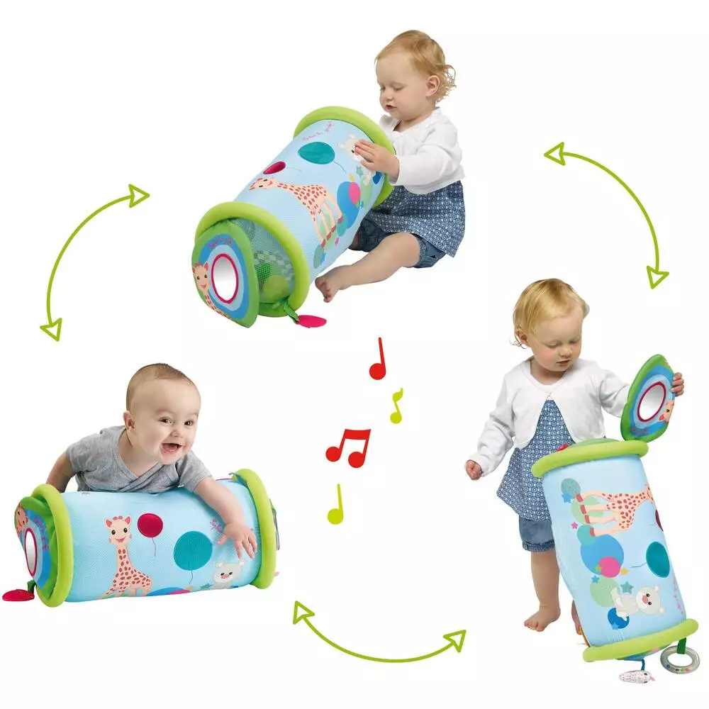 Un rouleau à escalader, à faire rouler et à chevaucher. Sa structure gonflable recouverte de tissu apporte confort, douceur et sécurité. Plusieurs activités à découvrir, pour développer les 5 sens de bébé : un miroir et des contrastes noir/blanc pour stimuler la vue; des balles sonores à l’intérieur du rouleau à faire rebondir, du papier froissé intégré dans la housse, un bruiteur caché dans Kiwi l’oiseau, pour stimuler l’ouïe; un anneau texturé à mordiller, pour soulager les poussées dentaires; des textures et matières variées et un filet à soulever afin d’éveiller la curiosité de bébé. Très léger et rapide à gonfler, le Rollin’Sophie se transporte facilement. Pratique ! La housse est amovible et lavable.