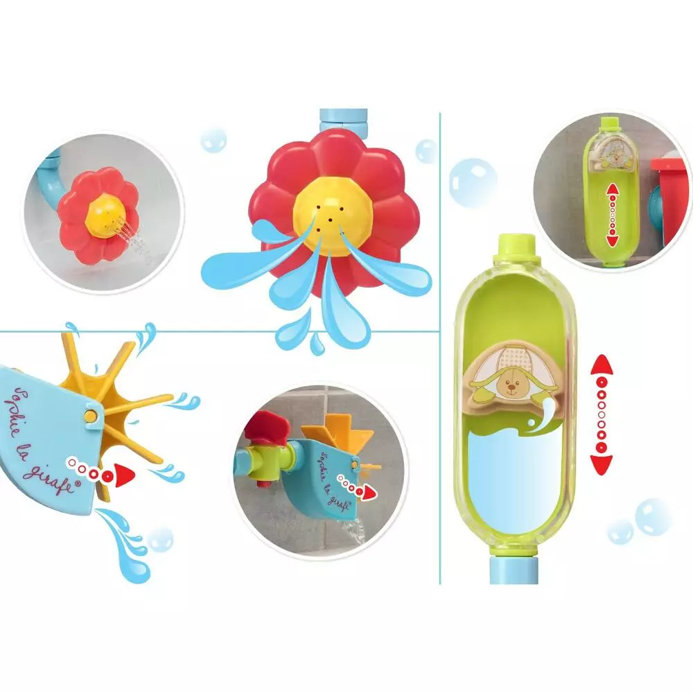 BĂ©bĂ© bricole dans son bain avec ses tuyaux, robinets et activitĂ©s diverses quâil monte et dĂ©monte ! Tout en sâamusant avec les circuits dâeau, bĂ©bĂ© apprend la notion de cause Ă effet ! Lorsquâil ouvre un des 3 robinets, bĂ©bĂ© peut voir: – Margot la tortue nager dans son bocal – le moulin tourner – lâeau jaillir de la fleur. Si bĂ©bĂ© ferme un des 3 robinets la fonction reliĂ©e sâarrĂȘte aussitĂŽt. Lorsque les 3 robinets sont fermĂ©s : – lâeau monte dans le rĂ©servoir principal et Sophie la girafe apparait comme par magie avec son masque et son tuba ! Se fixe facilement Ă la paroi de la baignoire grĂące Ă son systĂšme de ventouses.