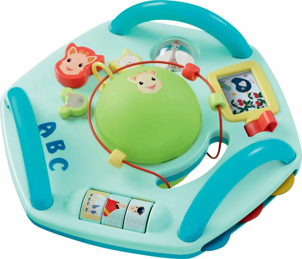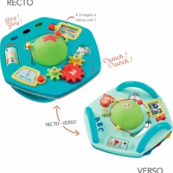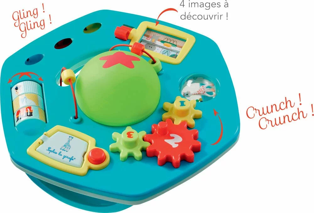 Un tableau d’activités recto verso à 360 pour encore plus de jouabilité Evolutif, il offre plusieurs positions de jeux à plat ventre, assis, à quatre pattes Une vraie innovation Une fois retourné, grâce à sa balle souple et ses poignées, le plateau devient un espace de motricité et offre une multitude de façons de jouer Nombreuses activités pour éveiller les sens de bébé et développer sa motricité. Une Balle amovible avec des grelots à l’intérieur, un incontournable de l’éveil à agiter, à faire rebondir ou à lancer. Des engrenages à faire tourner pour entendre un bruit de crécelle Malin Sur le verso du tableau, les engrenages sont remplacés par Sophie et ses amis, à qui on fait tourner la tête. 3 parcours de billes, dont 1 traversant pour développer la motricité fine de bébé. Un miroir surprise caché derrière une porte « pop up » qui s’ouvre quand on appui sur le bouton. 4 images à découvrir en actionnant la manette Bébé découvre les animaux de compagnie et leur nourriture préféré. Un puzzle adapté aux tout petits 3 images à reconstituer pour apprendre les différents métiers Rigolo, avec la fonction Mix’n’Match bébé crée des nouvelles images et développe son imagination et gagne à tous les coups. Une balle transparente avec des billes à faire tourner. 3 cymbales pour les premiers concerts de musique Grâce à sa conception unique, Vice Versa offre à bébé des heures d’amusement Facile à transporter grâce à ses poignées pour accompagner bébé dans tous ses déplacements.